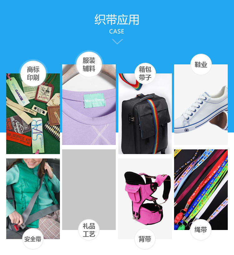 產品應用: | 產品主要用于商標印刷、服裝、箱包、鞋業、工藝禮品、手機帶、背帶、安全帶、包邊帶及寵物帶等 | ||||